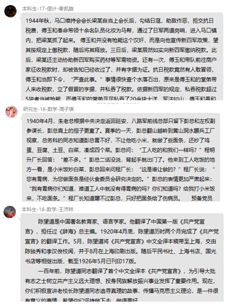 期间,100名同学还通过QQ群开展了“接力讲党史”线上活动,每天指定一名同学在群内分享一个党史微故事,微故事紧紧围绕《中国共产党简史》内容,以时间为轴,按照重大事件、重要地点、重要会议、重要人物展开。