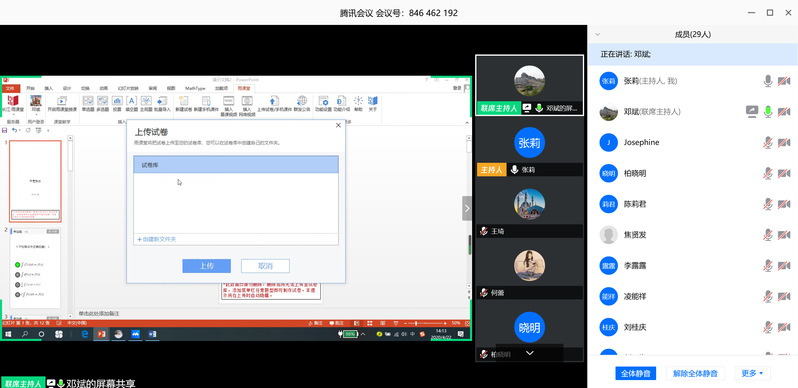 张莉首先传达了学校关于线上考核的原则性意见,如:线上考试的命题建议采用问答题、设计题等主观题形式,尽量少出现客观题,不出偏题、怪题,不随意把教学大纲规定的闭卷考试改为开卷考试。接着,张莉分别请邓斌主任、王琦主任介绍了两种线上考试的形式,邓斌主任介绍了长江雨课堂线上考试的操作流程及注意事项,王琦主任就小规模线上补考,提出了腾讯会议在线监考结合笔试作答的考试方式。老师们就各自课程特点、考试平台的选择、命题方式、监考机制等方面进行了探讨。