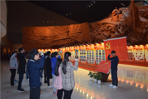 在展馆内,同学们参观了渡江战役纪念馆陈列的作战场景、形势图、作战工具等,跟随渡江战役发展进程,与先烈重走战役历程,结合惟妙惟肖的人物蜡像,生动精彩的视频音像以及珍贵的历史文物,近距离、多方位地了解了历史上众多有名的风云人物,享受一次厚重文化的盛宴。在“胜利之师”群雕旁的党旗前,全体党员面向党旗庄严宣誓,重温了入党誓词。在感悟历史的同时,同学们对牺牲的无数革命先烈沉痛缅怀,寄予哀思。活动结束后,同学们纷纷表示,当看到墙上刻满的烈士名字时,心为之一振,如今的生活实属不易,作为青年学生,更应勇做时代的弄潮儿,为实现中国梦而不懈努力。