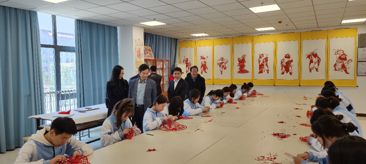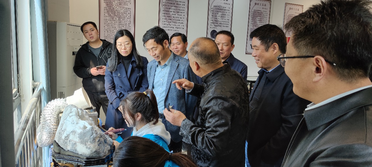 在灵璧县高级职业技术学校,朱士信教授、张莉院长一行首先参观考察了该校非遗传承学院,现场观看了磬石琴社团、剪纸社团、泗州戏社团等社团学生表演,对同学们高超技艺表示赞赏。