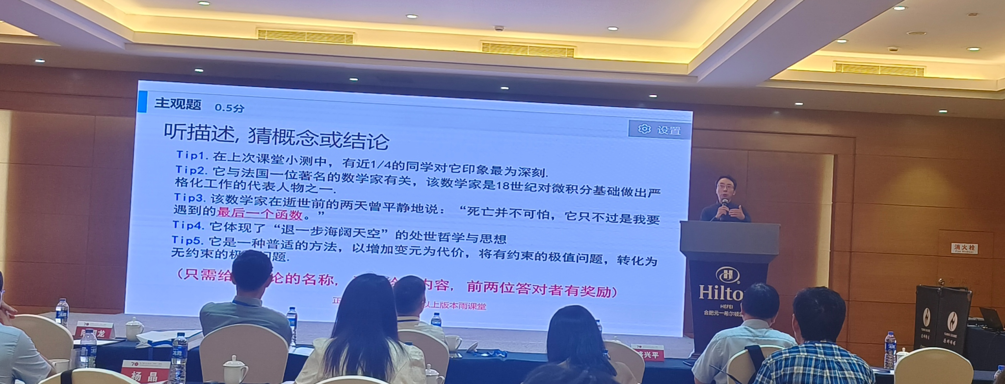 中国科学技术大学程艺教授、国防科技大学朱健民教授、西北工业大学张莹教授、新葡的京集团8814vip朱士信教授、阜阳师范大学储亚伟教授、清华大学杨晶副教授、高等教育出版社朱槿编辑分别以“一流课程建设的思考与实践”、“如何加强大学数学课程建设与虚拟教研室的深度融合”、“数智化背景下微积分课程的改革与创新”、“AI时代的大学数学教材建设的探索与实践”、“基于知识图谱的课程优化与智慧教学”、“数学基础课中融入四维式课程思政的实践与探索” 和“创新驱动 构建高质量教材体系”为题做了分享报告。