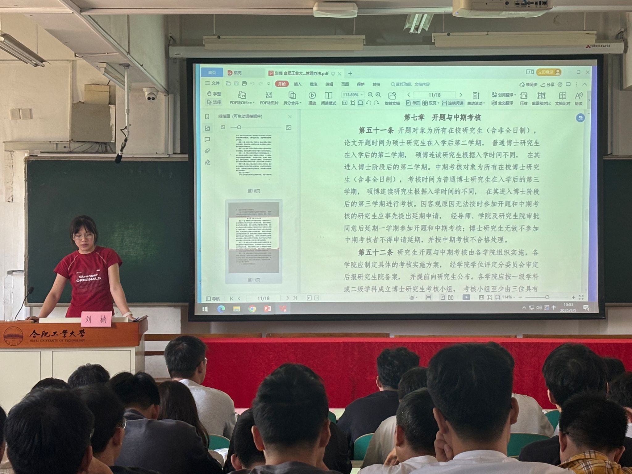 最后,研究生辅导员韩玉洁开展“心理健康教育与校纪校规教育”。她宣讲了心理健康知识,勉励全体新生能够坚定理想信念,厚植爱国爱校情怀,传承新葡的京集团8814vip “工业报国” 的光荣传统,将个人成长融入国家发展大局,以 “爱国之情、强国之志、报国之行” 开启研究生生涯;同时鼓励新生主动加强与师生的沟通交流,快速适应研究生学习与生活,在传承新葡的京集团8814vip优良文化的过程中,找准定位、明确目标,在学术道路上稳步前行。刘楠老师介绍了学籍管理规定等相关政策。