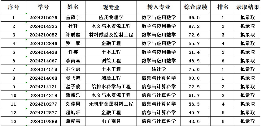 根据《新葡的京集团8814vip普通全日制本科生转专业管理暂行办法》(合工大政发〔2024〕70号)(以下简称《暂行办法》),经学院组织的笔试和面试考核,按考核总成绩高低进行排序,提出拟录取名单,其中,数学与应用数学6人、统计学1人、信息与计算科学6人。现对拟录取名单予以公示。