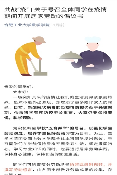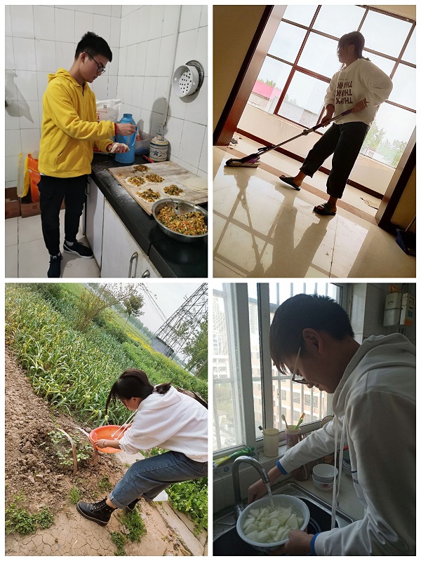 防疫期间,学院向全体学生发出《关于号召全体学生在疫情期间开展居家劳动的倡议书》,倡议学生居家期间通过敬老孝亲类劳动、生活习惯养成类劳动、创造性劳动和田间劳作类劳动等来培养积极劳动观念,养成良好日常劳动习惯。通过党员学习、主题班会,带领学生学习领悟劳动精神的可贵;通过榜样示范、群组讨论营造浓厚的劳动教育实践氛围。
