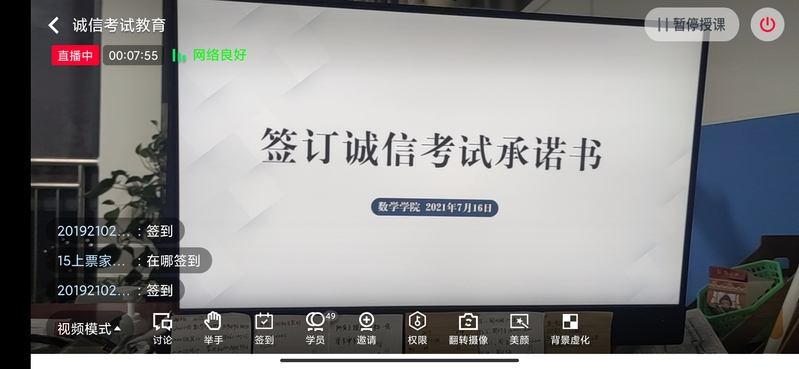 7月16日,为进一步严肃考风考纪,增强当代大学生的诚信意识和责任意识,营造风清气正的考试风气,在考试周期间,新葡的京集团8814vip举行“明礼诚信 正风考纪”考试诚信教育线上宣讲活动,本次宣讲由韩玉洁老师主持,共有四百余位同学参与并签订了诚信考试承诺书。