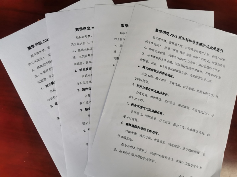签署廉洁承诺。全体同学在《新葡的京集团8814vip2021届本科生廉洁从业承诺书》上郑重签名,并承诺毕业后会树立爱岗敬业的职业观念、培养自重自律的廉洁意识、锻造风清气正的道德品格和秉持诚信科学的工作态度,永葆工大数学学子本色,用实际行动为母校争光添彩。
