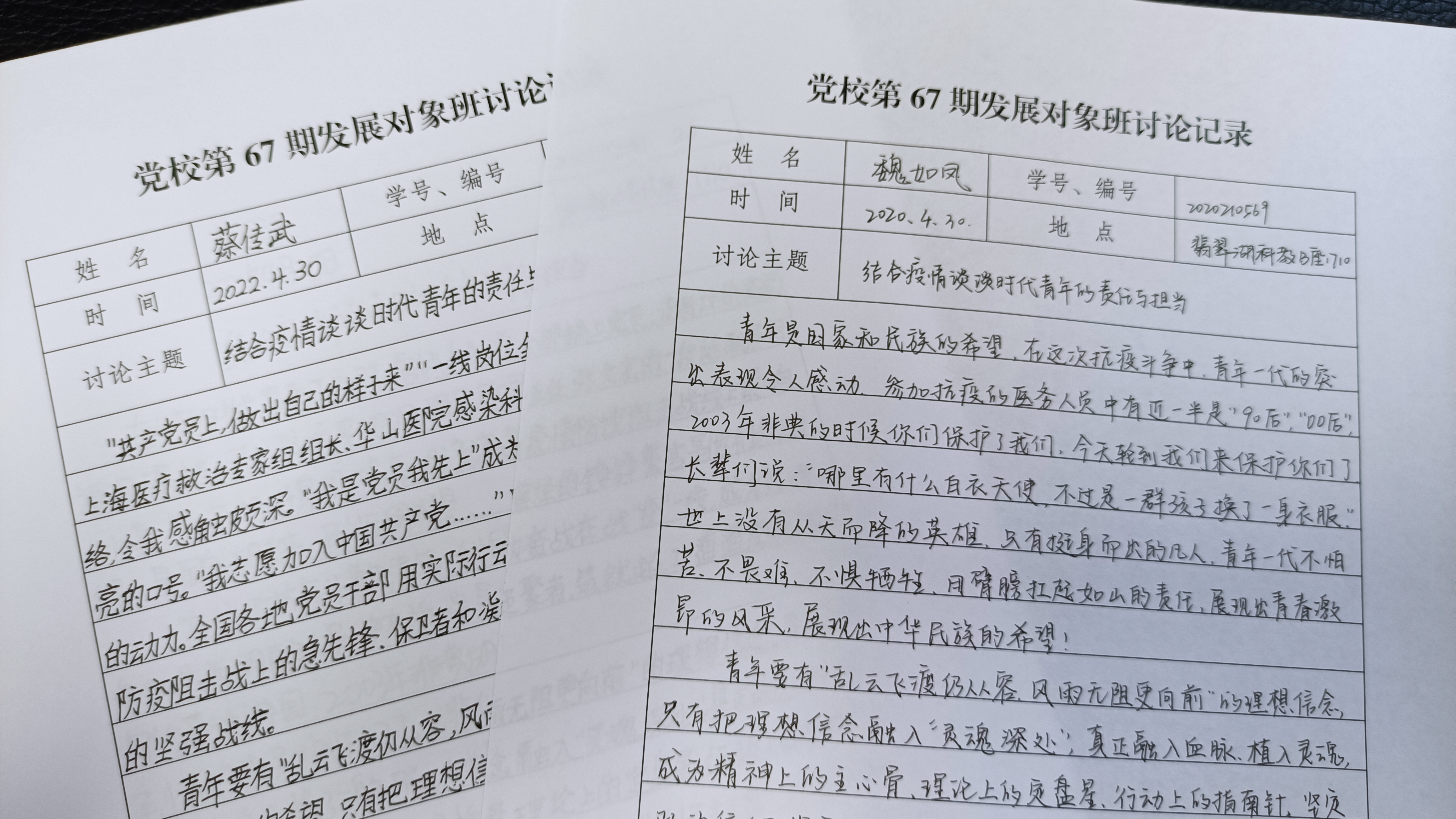 本次集中研讨结束后,发展对象班成员还开展为期三次的小组学习研讨,围绕“为什么要坚定理想信念?”“结合疫情谈谈时代青年的责任与担当。”等问题,同学们结合本次课程学习内容,疫情期间的志愿服务情况,分享了自己的心得体会。