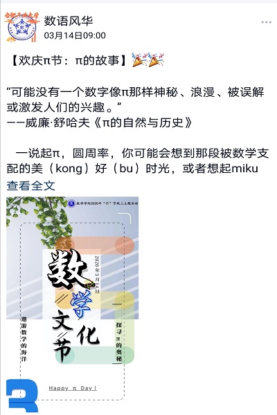 为了促进疫情期间学生身心和谐,涵育文化素养,深化疫情居家第二课堂不断线,激发学生参与数学、探讨数学、热爱数学的热情,3月14日新葡的京集团8814vip2020年“π”节活动依托网络平台多渠道、全方位开展。