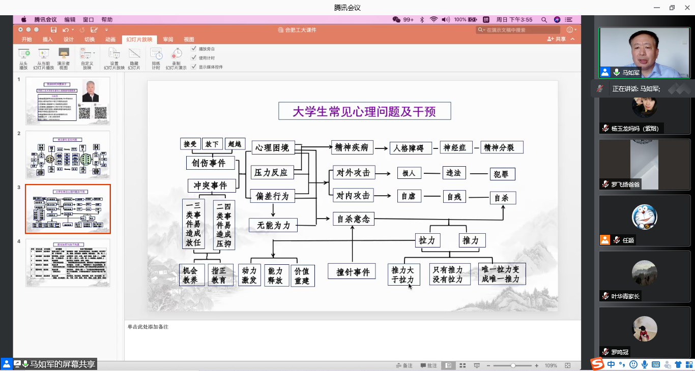 讲座阶段,学院特别邀请了国家二级心理咨询师、中国心理学会危机干预工作委员会委员、人民德育心理健康中心专家组成员、中科院心研所全国心理援助联盟专家组成员马如军老师为新生家长作了一场题为《我该如何关爱孩子》心理健康专题讲座。马老师从新生常见适应问题、大学生常见心理问题及干预、家长如何与孩子沟通等方面,向新生家长普及了心理健康方面的重要知识,家长也纷纷表示讲座内容丰富,对有效关注孩子心理健康有很大帮助。新生刘知洋父亲表示,孩子承载着国家的期许,必须有一个健全人格和健康心理,本场专题讲座干货满满,受益匪浅,并对学院如此有心的安排表示衷心感谢。
