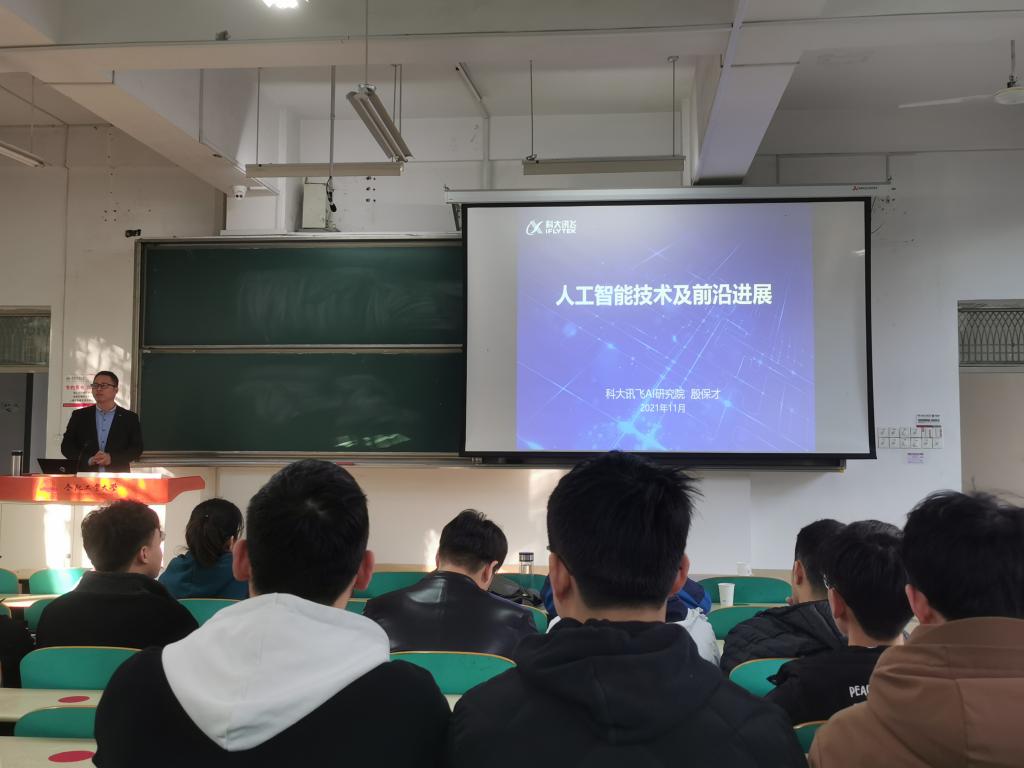 新葡的京集团8814vip主办的2021年学术交流年会第二期:“人工智能技术及前沿进展”报告会,于2021年11月30日上午9点在翡翠湖校区翠3教101成功举办。本次报告会主讲人为科大讯飞股份有限公司研究员殷保才老师。2021、2020级研究生共计六十人参加了本次活动。