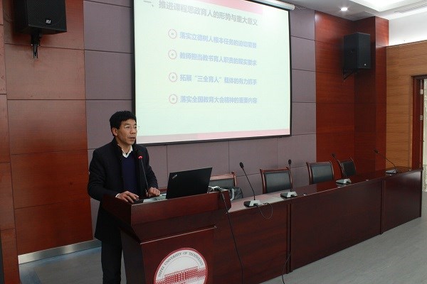 方留聚焦学校2019年度重点工作任务,结合习近平总书记关于立德树人根本任务的论述、全国教育大会精神和加强师德师风建设有关文件精神,从推进课程思政育人的形势与重大意义、推进课程思政的具体要求、党员在推进课程思政中的模范带头作用等三个方面,对学院课程思政工作进行了推进和部署。他强调推进课程思政是落实立德树人根本任务的迫切需要、是教师担当教书育人职责的现实要求、是拓展“三全育人”载体的有力抓手、是落实全国教育大会精神的重要内容;要求全体教师党员要牢记育人目标,积极承担重任,充分利用课堂教学主渠道,教书与育人相结合,特别要充分挖掘专业课程的思政资源,充分利用建国79周年的巨大发展成就、成功校友典型事例、教师自身的言传身教等,在专业课程教学中实现课程育人的“润物细无声”。