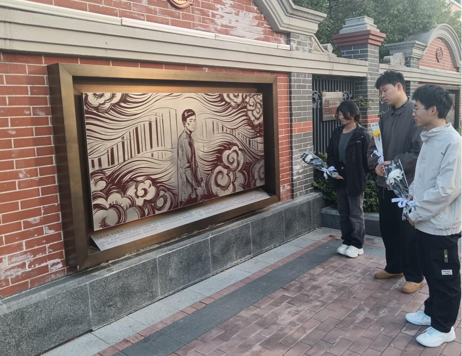 观影结束后,同学们怀着崇敬之心前往延乔路纪念碑。作为纪念陈延年、陈乔年烈士的红色地标,“延乔路”与“集贤路”“繁华大道”呼应,寓意先烈精神指引民族走向繁荣。同学们参观路侧文化纪念墙,通过浮雕壁画与文字介绍,深入了解烈士从热血青年成长为坚定共产主义战士的历程。纪念墙上“这盛世,如你们所愿”的字样,让大家深切感慨和平繁荣的来之不易。